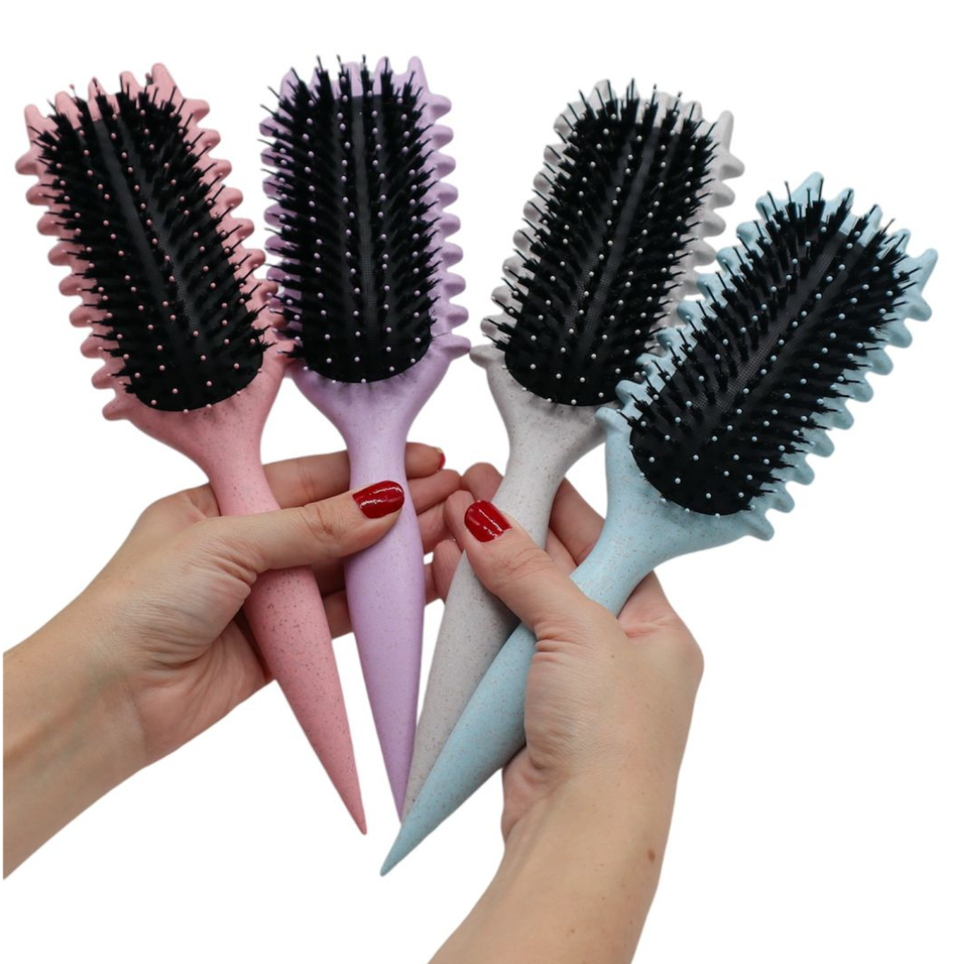 Diseñado especialmente para las necesidades del cabello rizado, este cepillo combina ergonomía, tecnología y versatilidad en una herramienta imprescindible para tu rutina de peinado. Su mango ergonómico antideslizante brinda mayor control y comodidad, mientras que sus cerdas de doble longitud —largas con puntas redondeadas y cortas para soporte— crean la tensión ideal para moldear y definir los rizos sin maltratarlos.